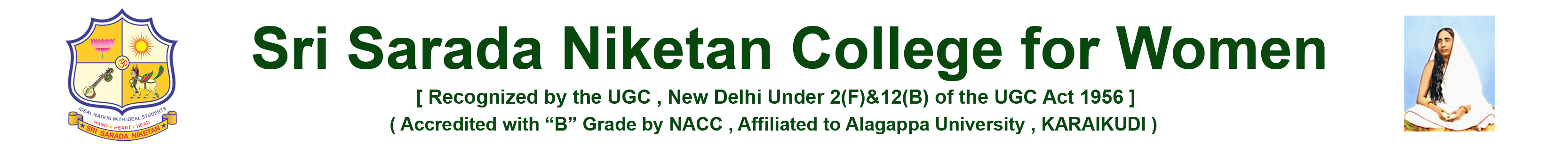Sri Sarada Niketan College for Women, Amaravathipudur, Karaikudi accords a warm welcome to all who visit this web-site and others as well who may do so sooner or later. ‘Educate a Girl; Educate a Generation’. The reward from girl’s education is multiple, divergent and exponential. Sri Sarada Niketan College for Women, Amaravathipudur, Karaikudi is committed to provide exponentially rewarding education to women, laced further with spiritual nuances, cultural shades and national hallmarks making the learning holistic and benefitting the society and nation as much as the individual.