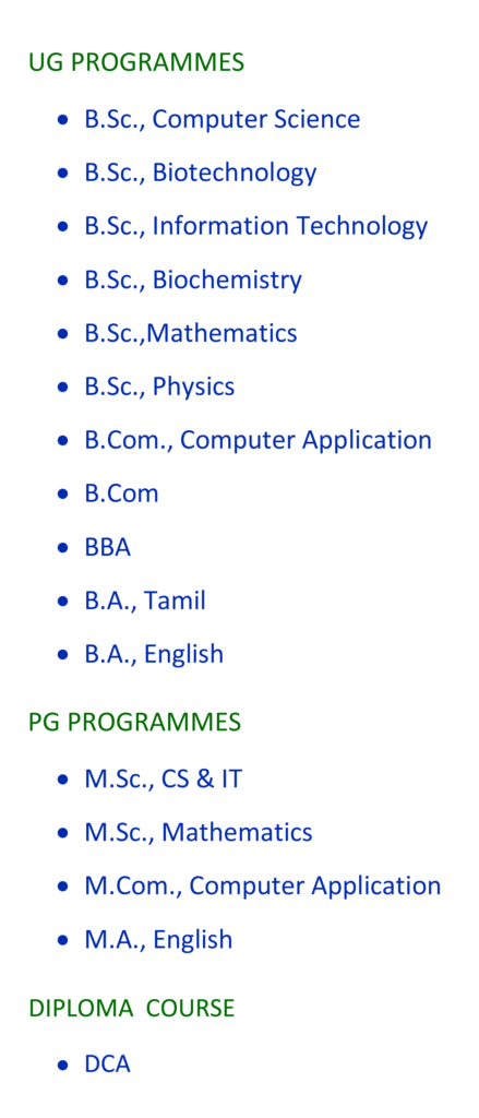 Menu Home About Us Principal Desk Management Secretary Trust Members Academics Departments Profile Syllabus Faculty Seminar Rank Holders Calender Academic Toppers Admission Programmes Offered Prospectus Scholarship Activities Functions Blissfest Annaiyar Jayanthi College Day Convocation Day Navarathri Gallery News&Events IQAC Examination Contact Programmes Offered